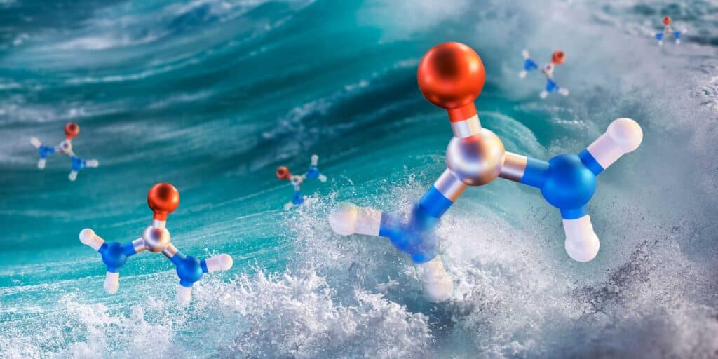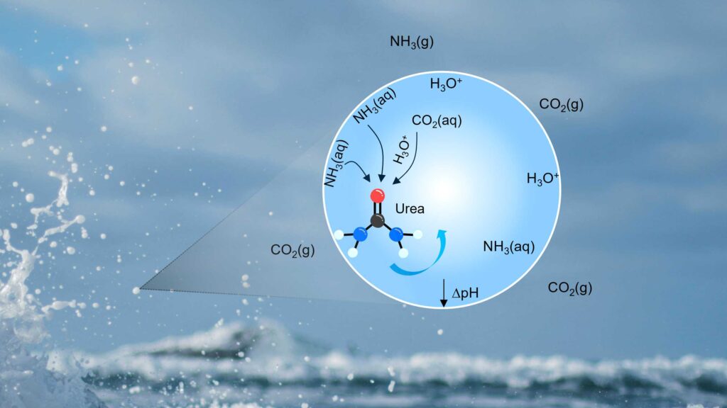 Dazu untersuchte Signorells Team feinste Wassertröpfchen, wie man sie etwa in Meeresgischt oder feinem Nebel finden kann. Die Forschenden beobachteten, dass sich Harnstoff unter Umgebungsbedingungen spontan aus Kohlenstoffdioxid (CO₂) und Ammoniak (NH₃) in der Oberflächenschicht der Wassertröpfchen bilden kann. Die physikalische Grenze zwischen Luft und Flüssigkeit sorgt an der Wasseroberfläche für ein spezielles chemisches Milieu, das die spontane Reaktion überhaupt erst ermöglicht.