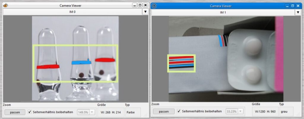 Pharmazeutische Produkte verwenden oft komplexe Codes zur Identifikation wie etwa Pharmacodes und Farbringcodes. Im Gegensatz zu herkömmlichen Barcodes können Pharmacodes in verschiedenen Farben gedruckt werden und besitzen keine Start-Stopp-Muster, was ihre Lesbarkeit erschwert. Der «EyeSens Pharma Code Reader» (PCR), der auf der EyeVision Software basiert, löst diese Herausforderung. Er ermöglicht eine hochpräzise und schnelle Erkennung von Pharmacodes, selbst bei suboptimaler Druckqualität. Neben der Code-Erkennung kann der EyeSens PCR auch Verfallsdaten, Etikettenpositionen und das Vorhandensein von Beipackzetteln überprüfen, was ihn als vielseitiges Werkzeug für die Qualitätskontrolle macht.